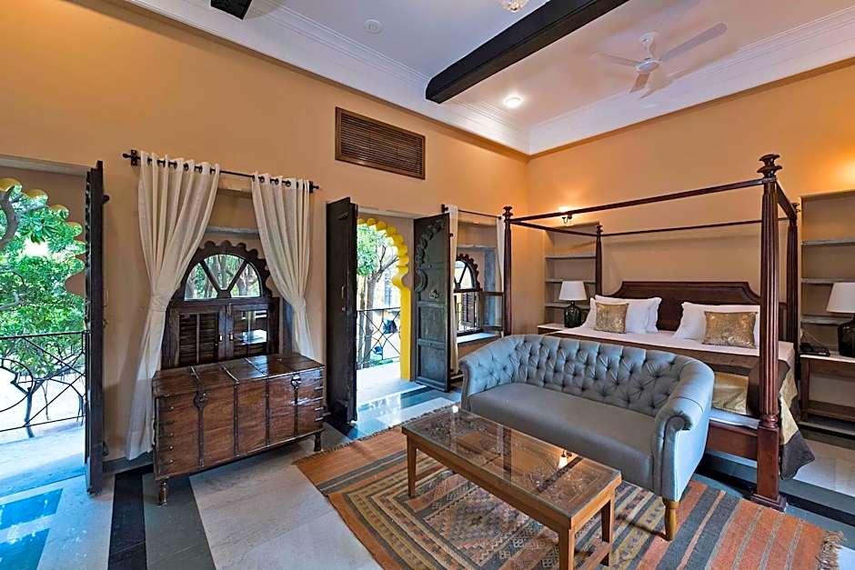 It’s old-world charm and the lifestyle of royalty with the high ceilings and four-poster beds and traditional handi lamps. Traditional Rajasthani and colonial furniture and spacious marble bathrooms complete the regal experience. These rooms range in size between 220-350 square feet. Four poster beds in these charming rooms. Some rooms have twin beds available as well. These rooms are ideally suited for two guests. A tea/coffee kettle along with daily replenishments of water to keep you hydrated at all times is available in the room. These rooms have palatial bathrooms that have patterned marble flooring and walls, and carved marble trays and bath accessories. Views from the room are overlooking the courtyards of the Palace.