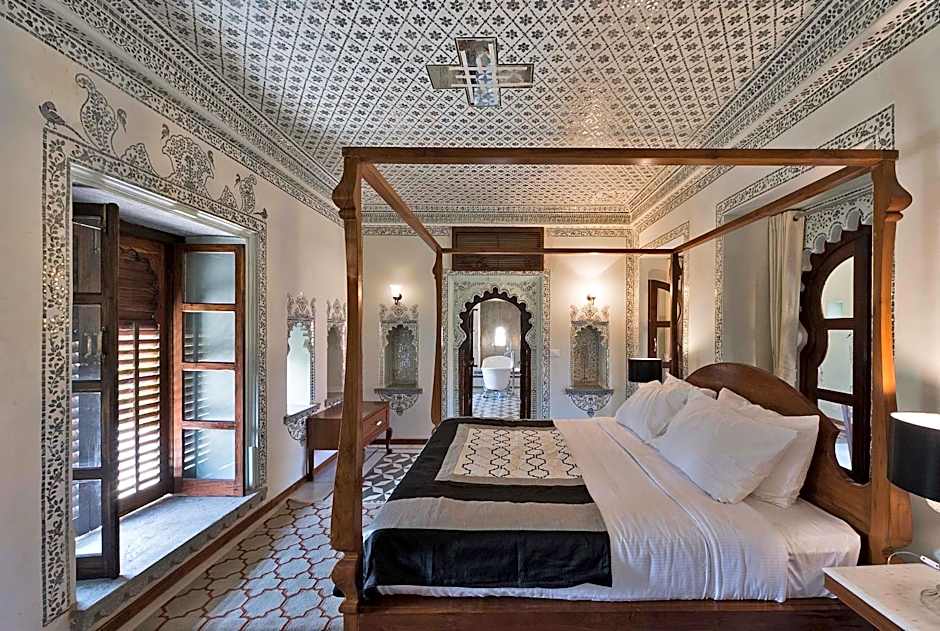 It’s old-world charm and the lifestyle of royalty with the high ceilings and four-poster beds and traditional handi lamps. Traditional Rajasthani and colonial furniture and spacious marble bathrooms complete the regal experience. These rooms range in size between 220-350 square feet. Four poster beds in these charming rooms. Some rooms have twin beds available as well. These rooms are ideally suited for two guests. A tea/coffee kettle along with daily replenishments of water to keep you hydrated at all times is available in the room. These rooms have palatial bathrooms that have patterned marble flooring and walls, and carved marble trays and bath accessories. Views from the room are overlooking the courtyards of the Palace.
